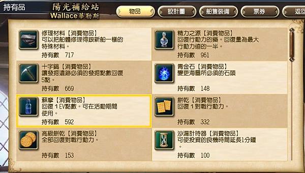 「選單」 > 「持有物」 = 就可以看到下方這張明細表。