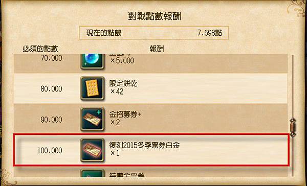 又稱低標,第一項最佳獎品,本次活動案例是10萬分的「復刻2015冬季票白金券」。